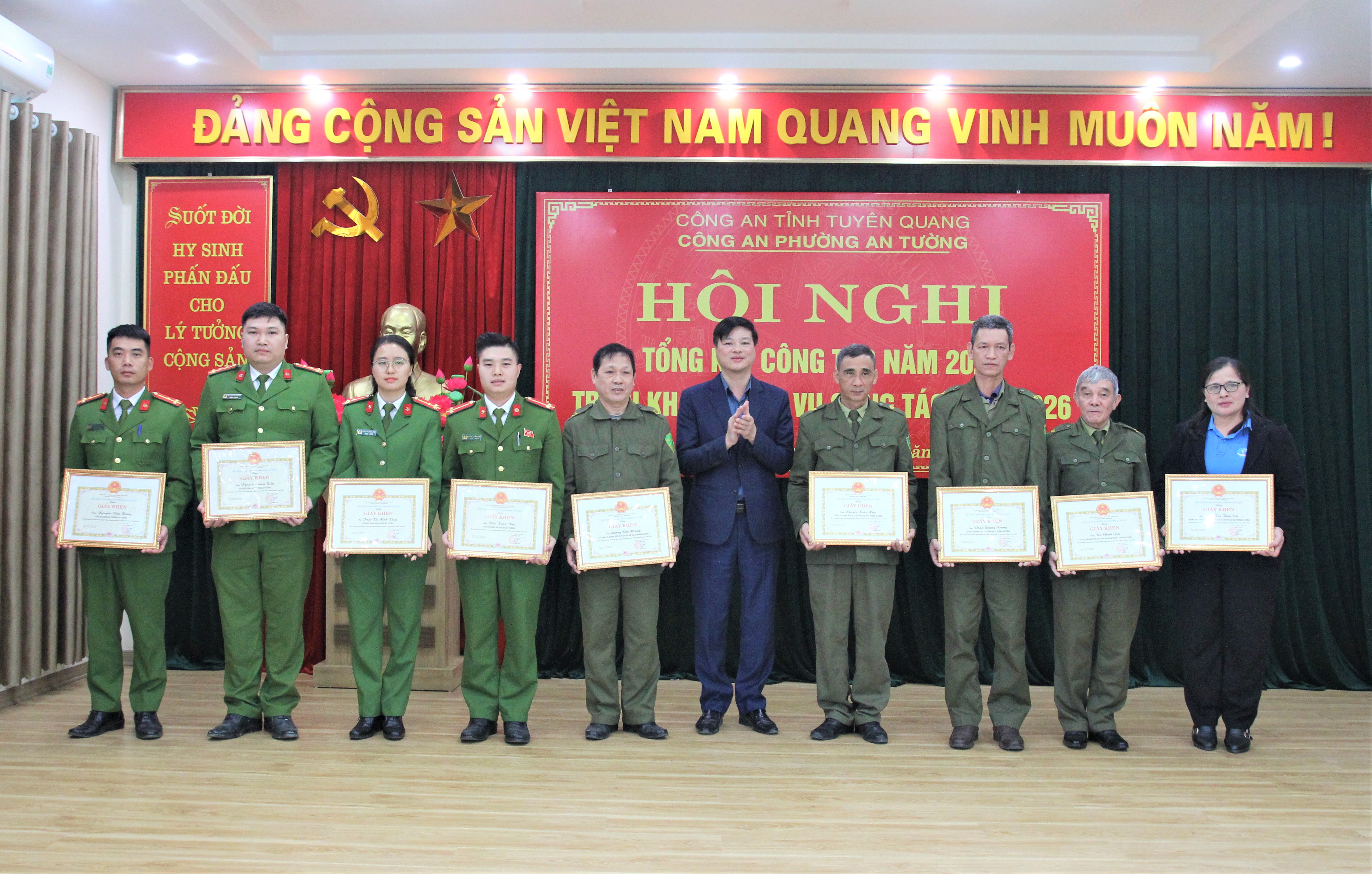 Đồng chí Vũ Quỳnh Loan, Phó Bí thư Thường trực Đảng ủy, Giám đốc Trung tâm Chính trị An Tường và đồng chí Đỗ Đình Đạt, Phó Bí thư Đảng ủy, Chủ tịch UBND phường trao Giấy khen của Chủ tịch UBND phường cho 01 tập thể và 08 cá nhân có thành tích xuất sắc trong phong trào thi đua “Vì an ninh Tổ quốc” năm 2025.