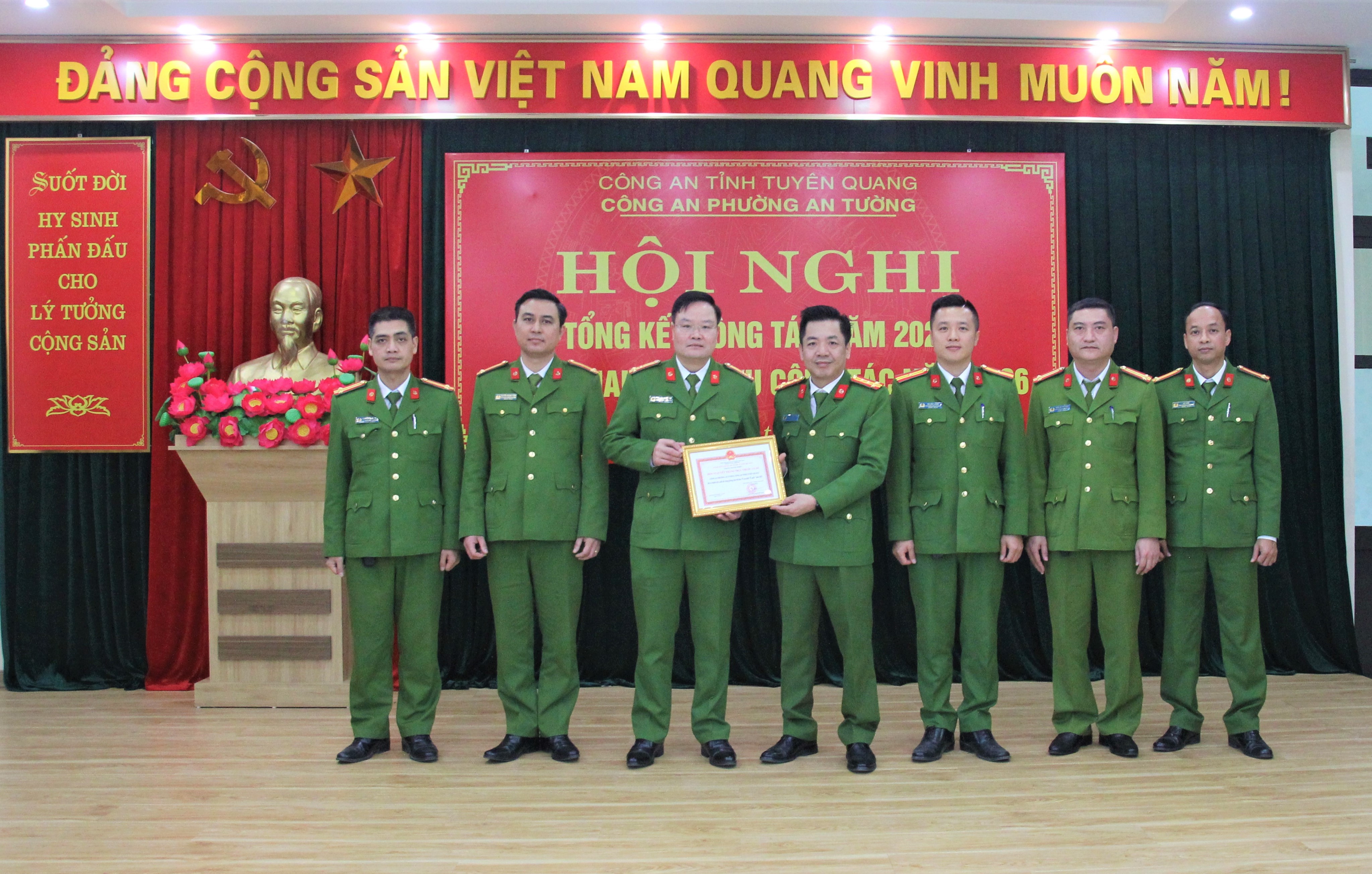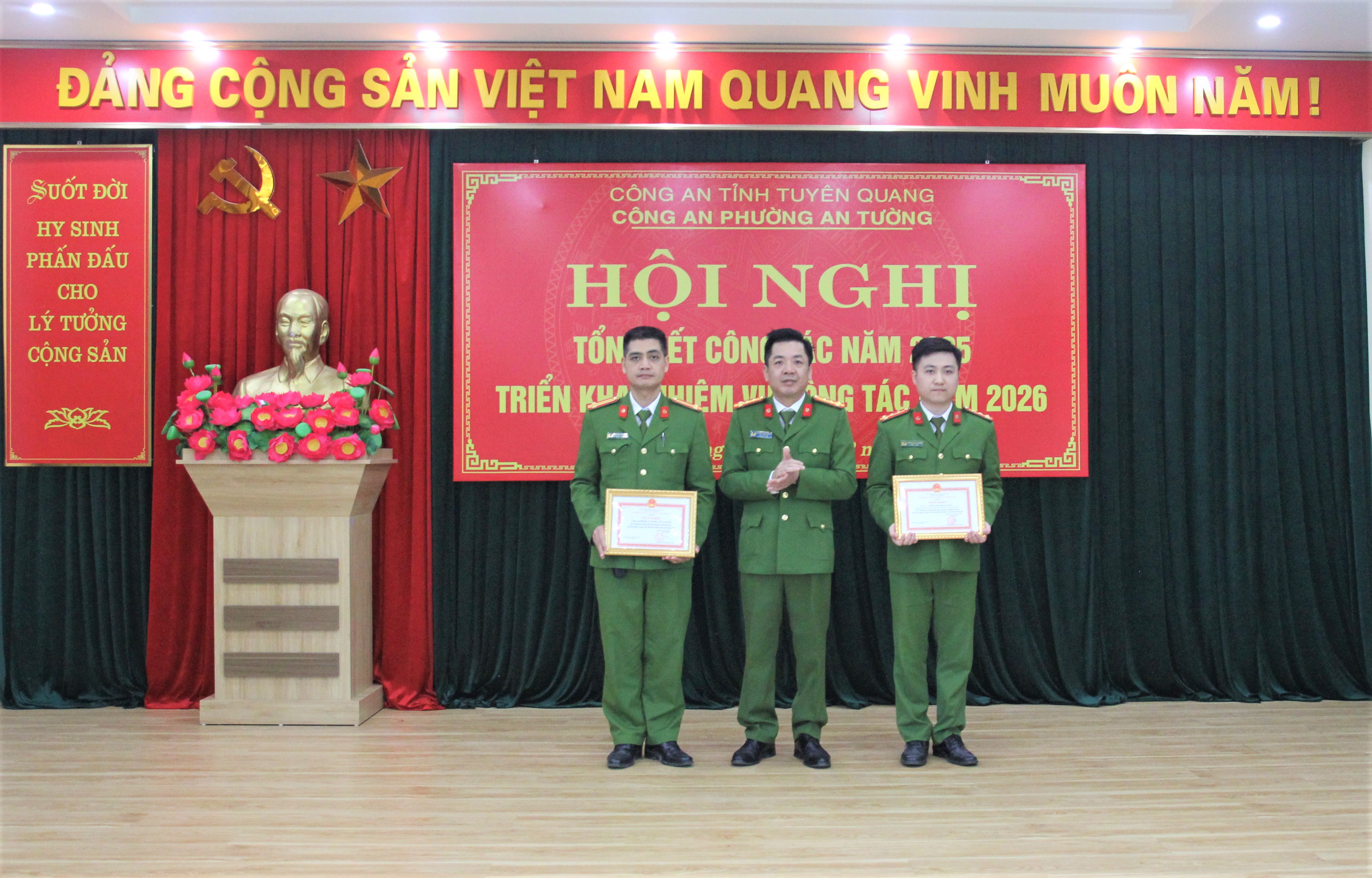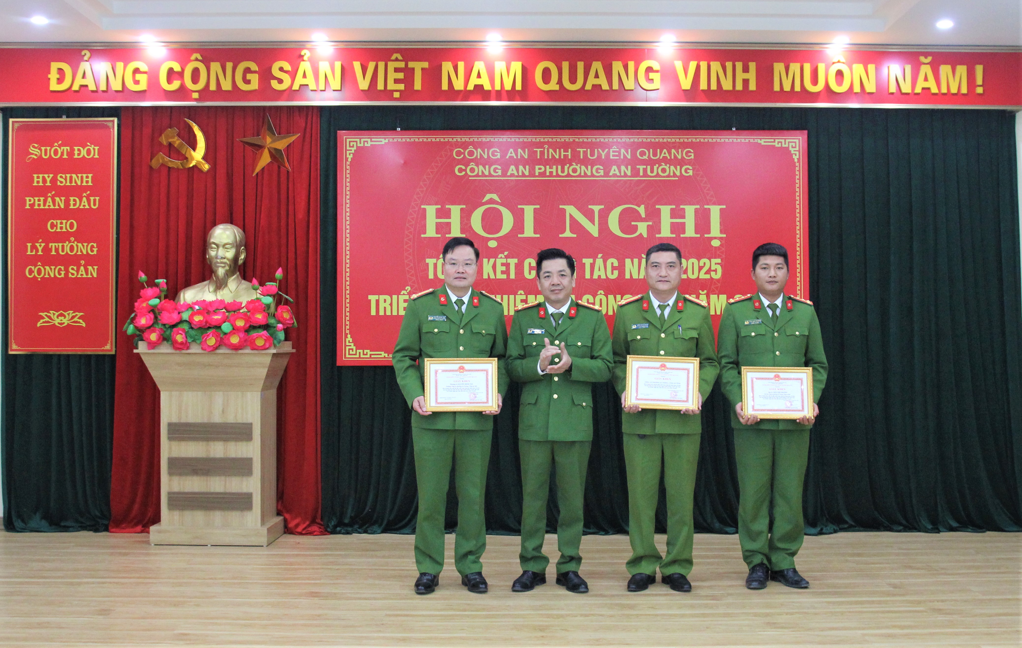 Nhân dịp này, thừa lệnh Giám đốc Công an tỉnh, đồng chí Đại tá Nguyễn Thành Chung, Phó Giám đốc Công an tỉnh đã trao Giấy khen của Giám đốc Công an tỉnh cho 02 tập thể và 03 cá nhân có thành tích xuất sắc trong các phong trào thi đua và thành tích đột xuất trong công tác. Đồng chí Vũ Quỳnh Loan, Phó Bí thư Thường trực Đảng ủy, Giám đốc Trung tâm Chính trị An Tường và đồng chí Đỗ Đình Đạt, Phó Bí thư Đảng ủy, Chủ tịch UBND phường đã trao Giấy khen của Chủ tịch UBND phường cho 01 tập thể và 08 cá nhân có thành tích xuất sắc trong phong trào thi đua “Vì an ninh Tổ quốc” năm 2025.