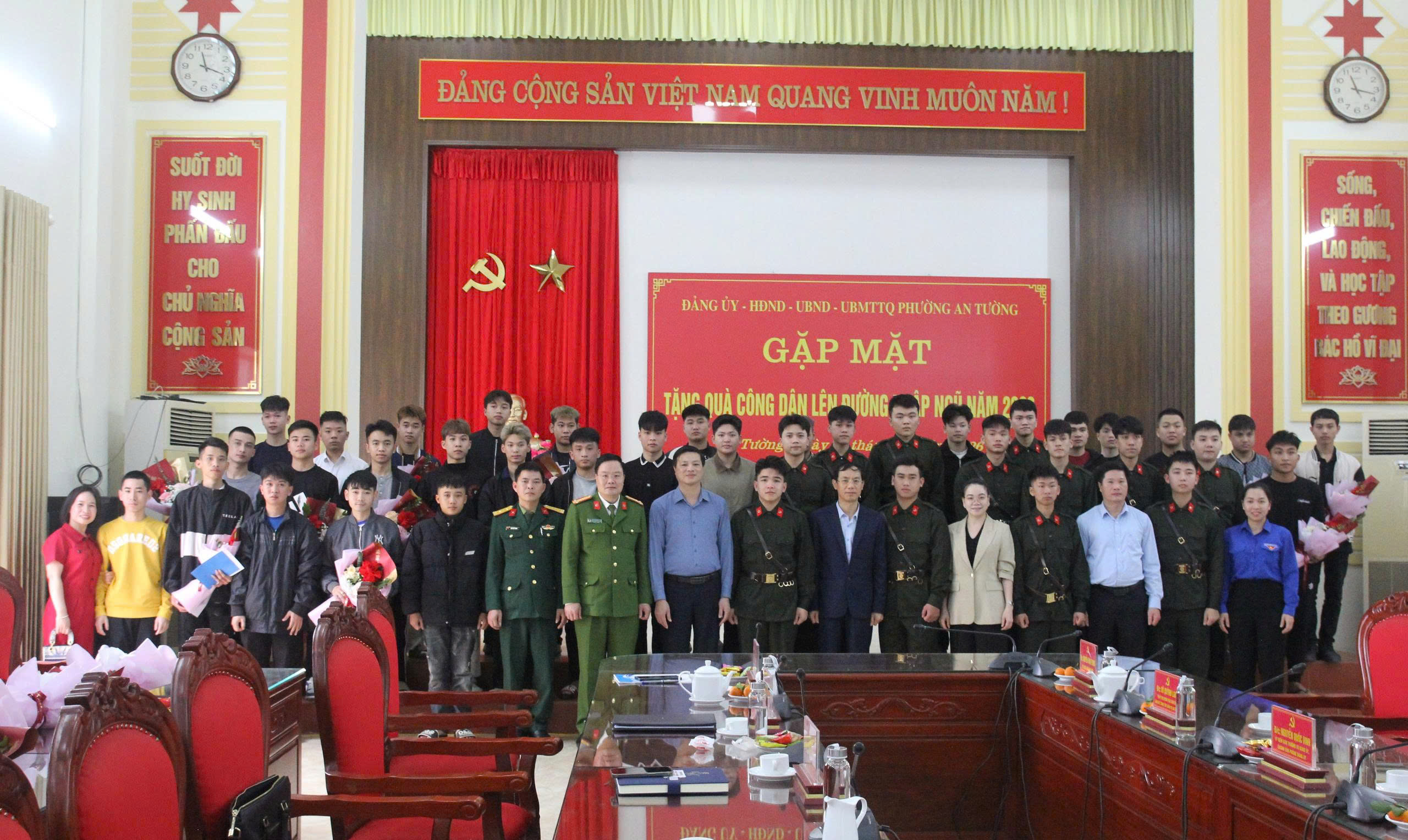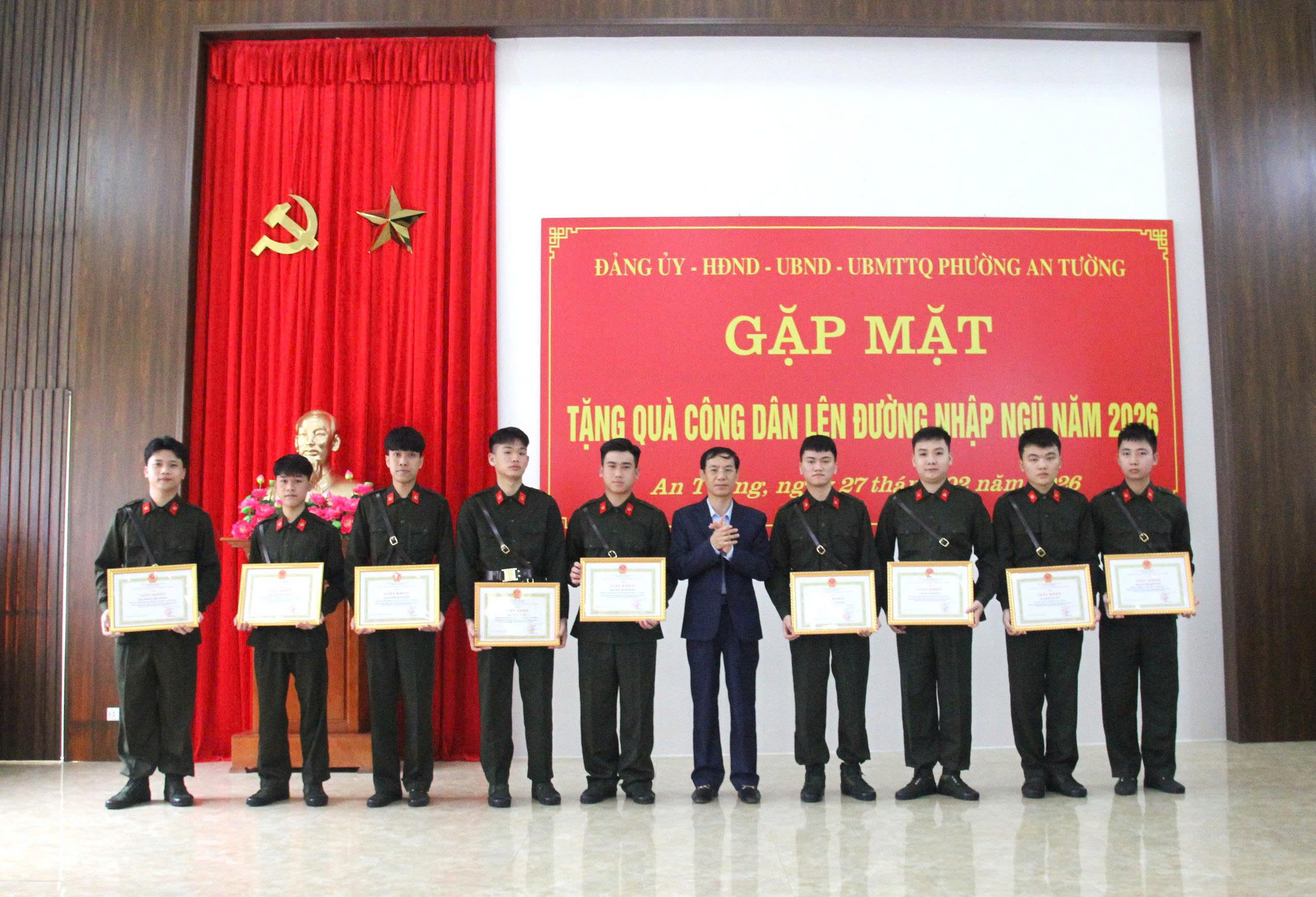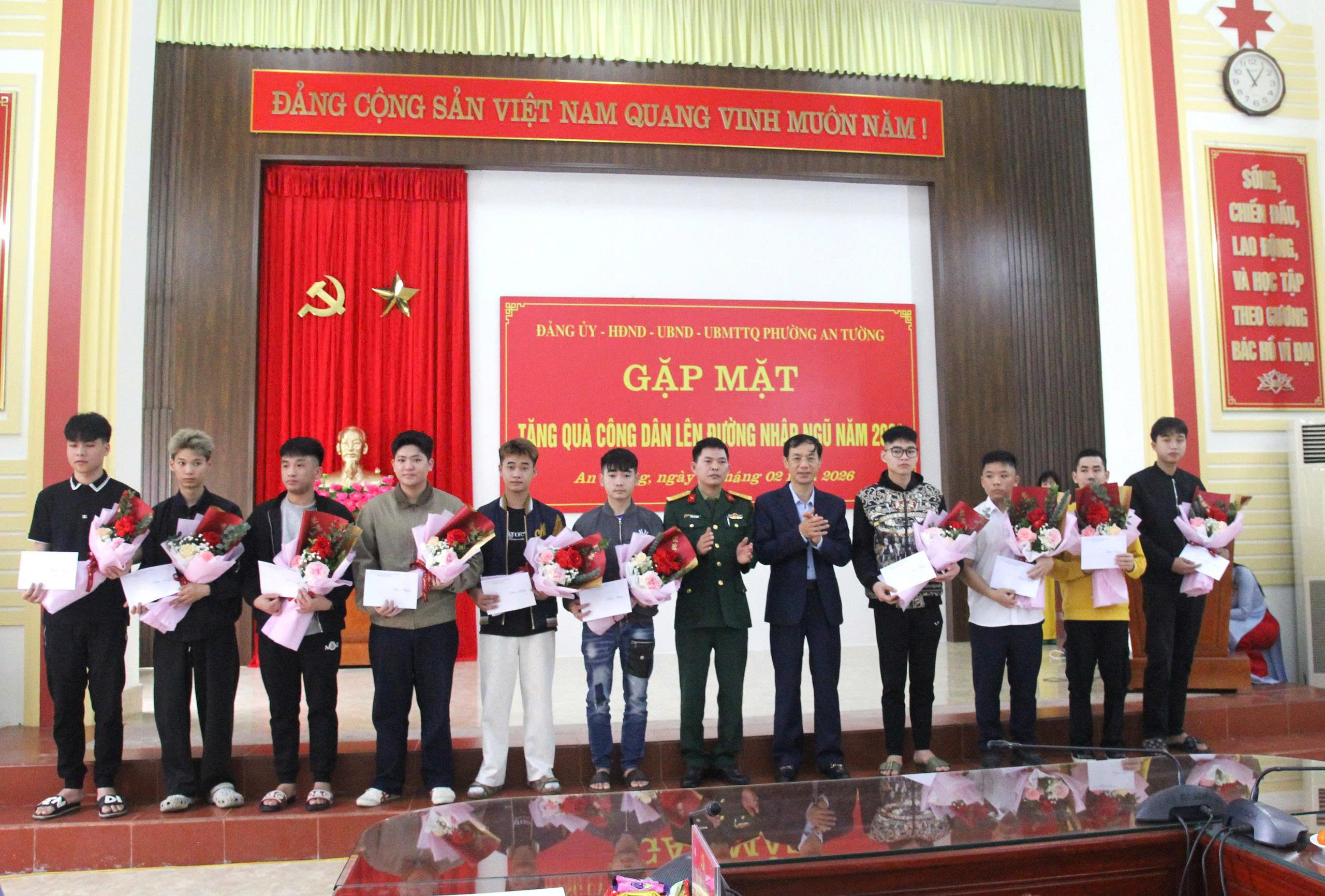 Tại buổi gặp mặt, các đồng chí lãnh đạo Đảng ủy, HĐND, UBND, Ủy ban MTTQ và Đoàn Thanh niên phường đã tặng hoa, quà động viên các công dân chuẩn bị lên đường nhập ngũ. Nhân dịp này, Chủ tịch UBND phường trao Giấy khen cho 28 thanh niên tiêu biểu đã viết đơn tình nguyện tham gia nghĩa vụ quân sự và tham gia nghĩa vụ Công an nhân dân năm 2026./.