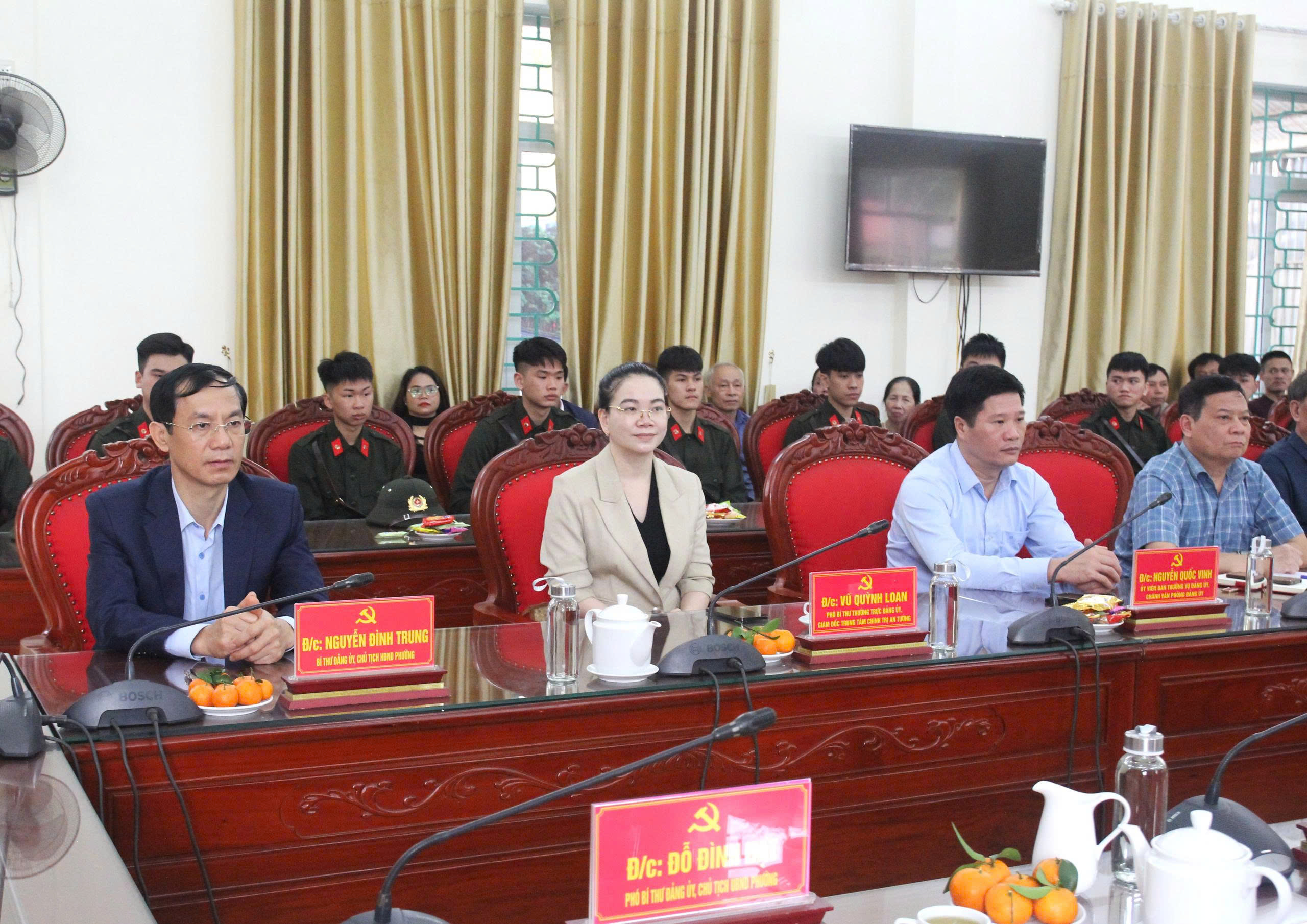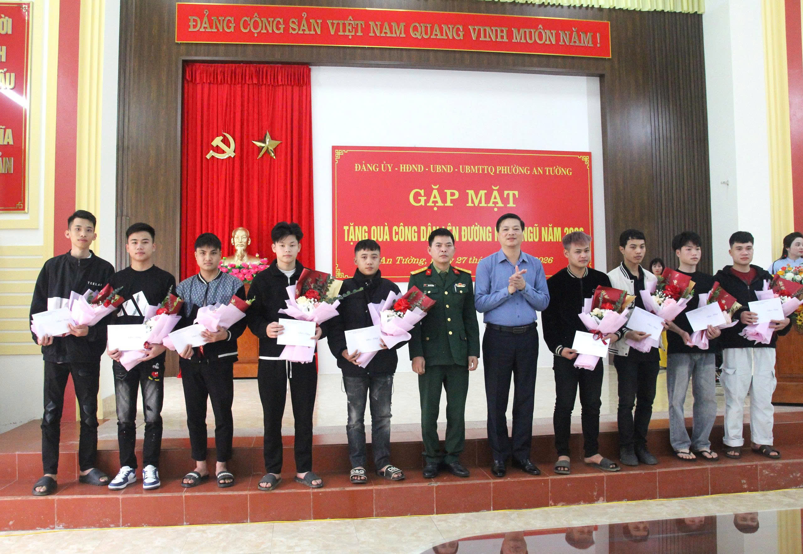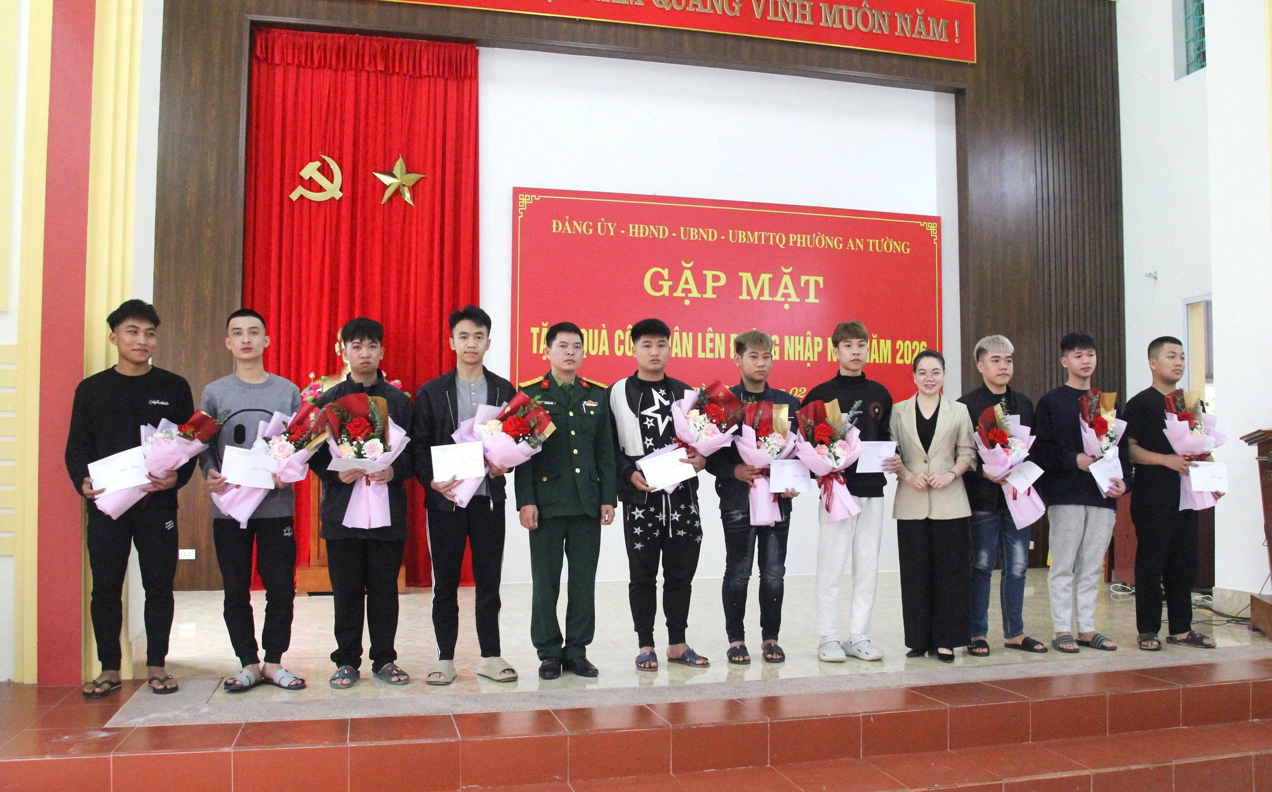 Dự buổi gặp mặt có các đồng chí: Nguyễn Đình Trung, Bí thư Đảng ủy, Chủ tịch HĐND phường; Vũ Quỳnh Loan, Phó Bí thư Thường trực Đảng ủy, Giám đốc Trung tâm Chính trị An Tường; Đỗ Đình Đạt, Phó Bí thư Đảng ủy, Chủ tịch UBND phường; các đồng chí Ủy viên Ban Thường vụ Đảng ủy phường; Thường trực HĐND, lãnh đạo UBND phường; lãnh đạo UB MTTQ và các tổ chức chính trị - xã hội phường; lãnh đạo Ban Chỉ huy Quân sự phường, Công an phường; lãnh đạo các cơ quan, đơn vị thuộc UBND phường; Tổ trưởng các Tổ dân phố có công dân nhập ngũ năm 2026.