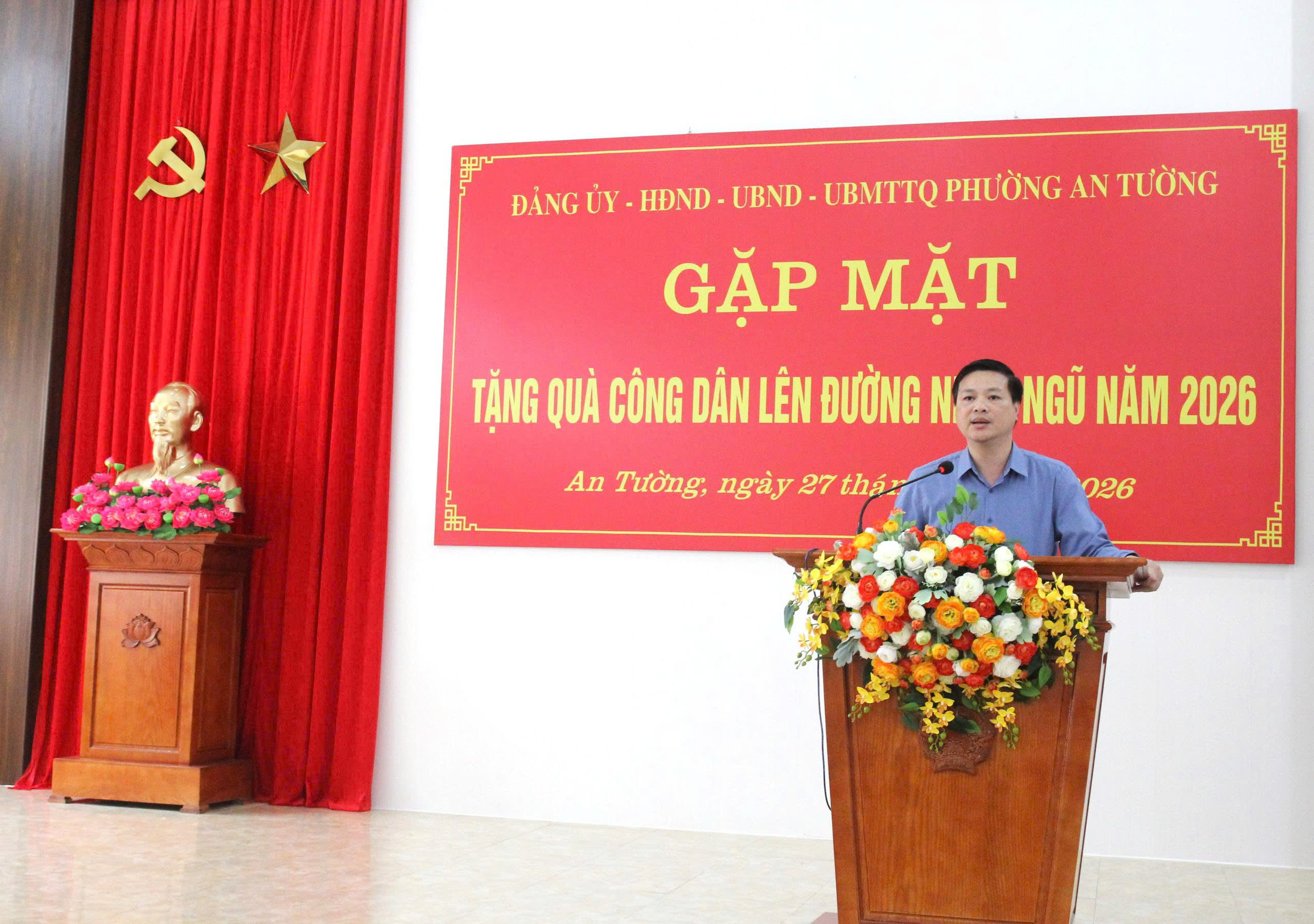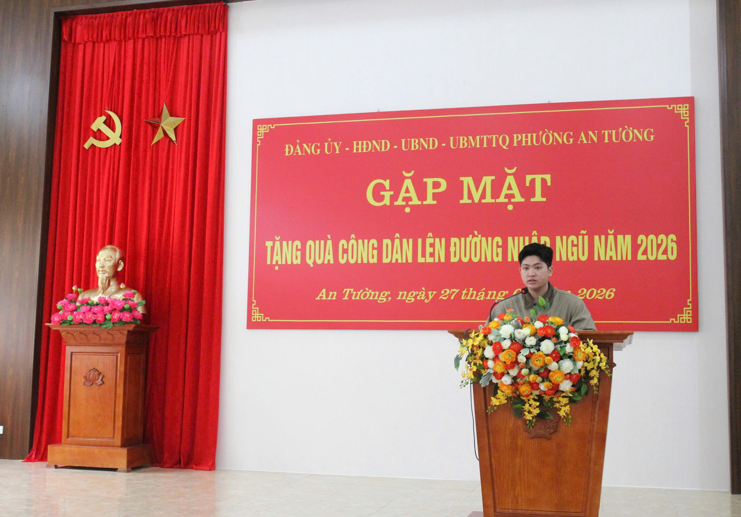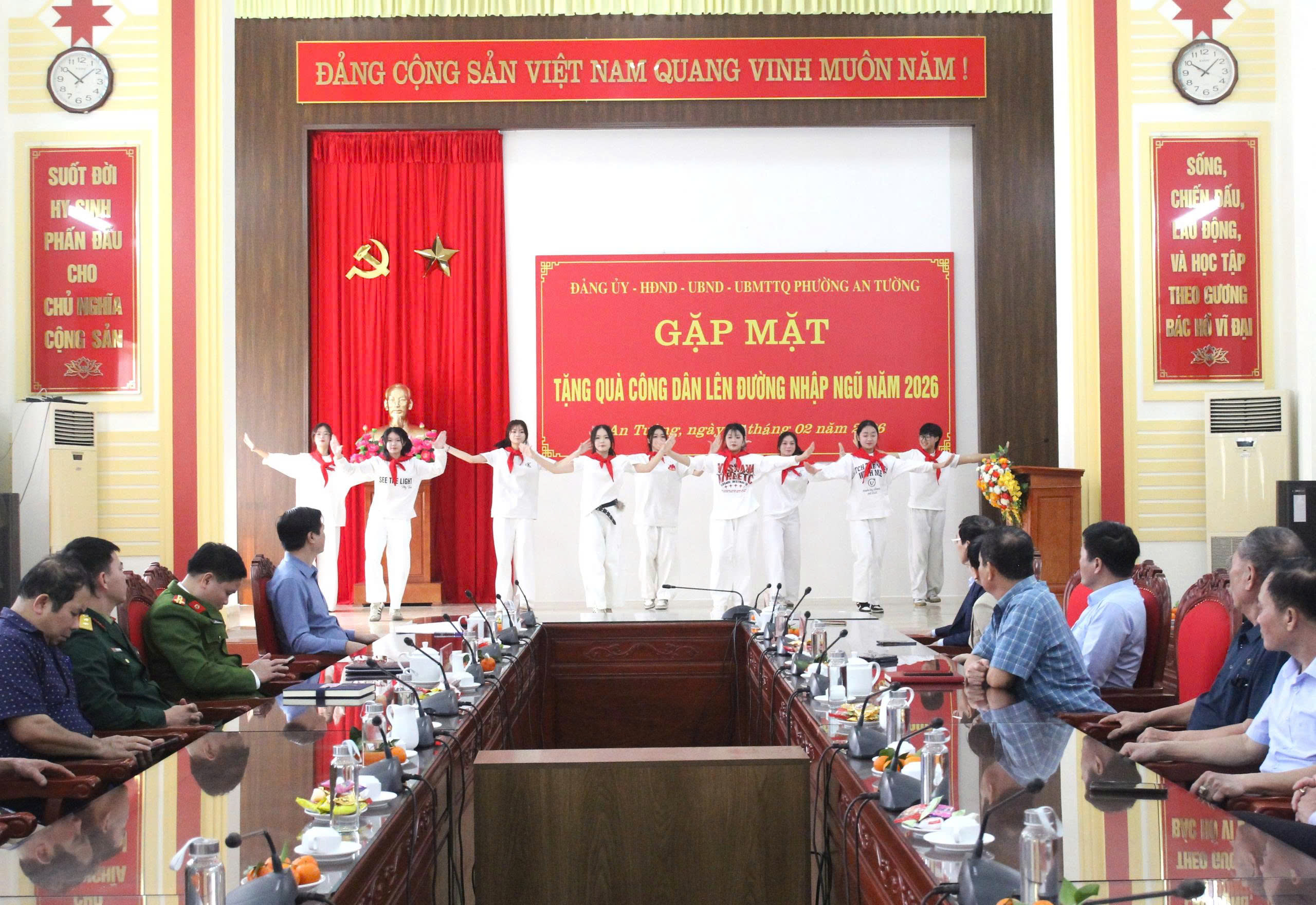 Dự buổi gặp mặt có các đồng chí: Nguyễn Đình Trung, Bí thư Đảng ủy, Chủ tịch HĐND phường; Vũ Quỳnh Loan, Phó Bí thư Thường trực Đảng ủy, Giám đốc Trung tâm Chính trị An Tường; Đỗ Đình Đạt, Phó Bí thư Đảng ủy, Chủ tịch UBND phường; các đồng chí Ủy viên Ban Thường vụ Đảng ủy phường; Thường trực HĐND, lãnh đạo UBND phường; lãnh đạo UB MTTQ và các tổ chức chính trị - xã hội phường; lãnh đạo Ban Chỉ huy Quân sự phường, Công an phường; lãnh đạo các cơ quan, đơn vị thuộc UBND phường; Tổ trưởng các Tổ dân phố có công dân nhập ngũ năm 2026.