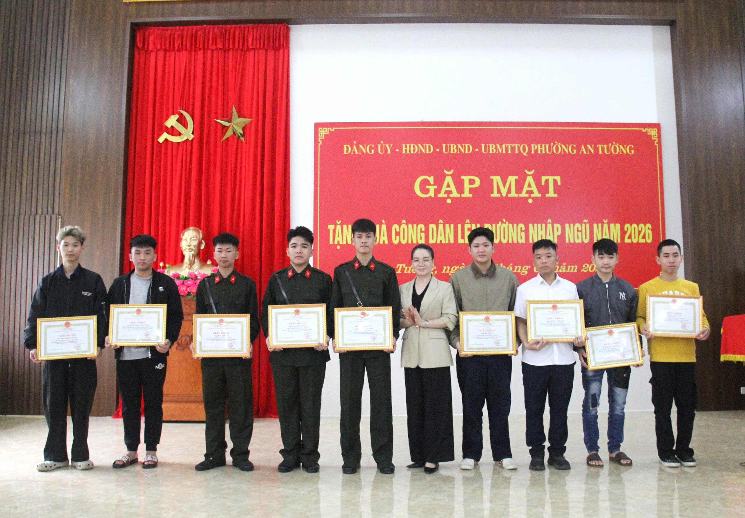 Đồng chí Vũ Quỳnh Loan, Phó Bí thư Thường trực Đảng ủy, Giám đốc Trung tâm Chính trị An Tường trao giấy khen cho các thanh niên viết đơn tình nguyện tham gia nghĩa vụ Quân sự và tham gia nghĩa vụ Công an nhân dân năm 2026.