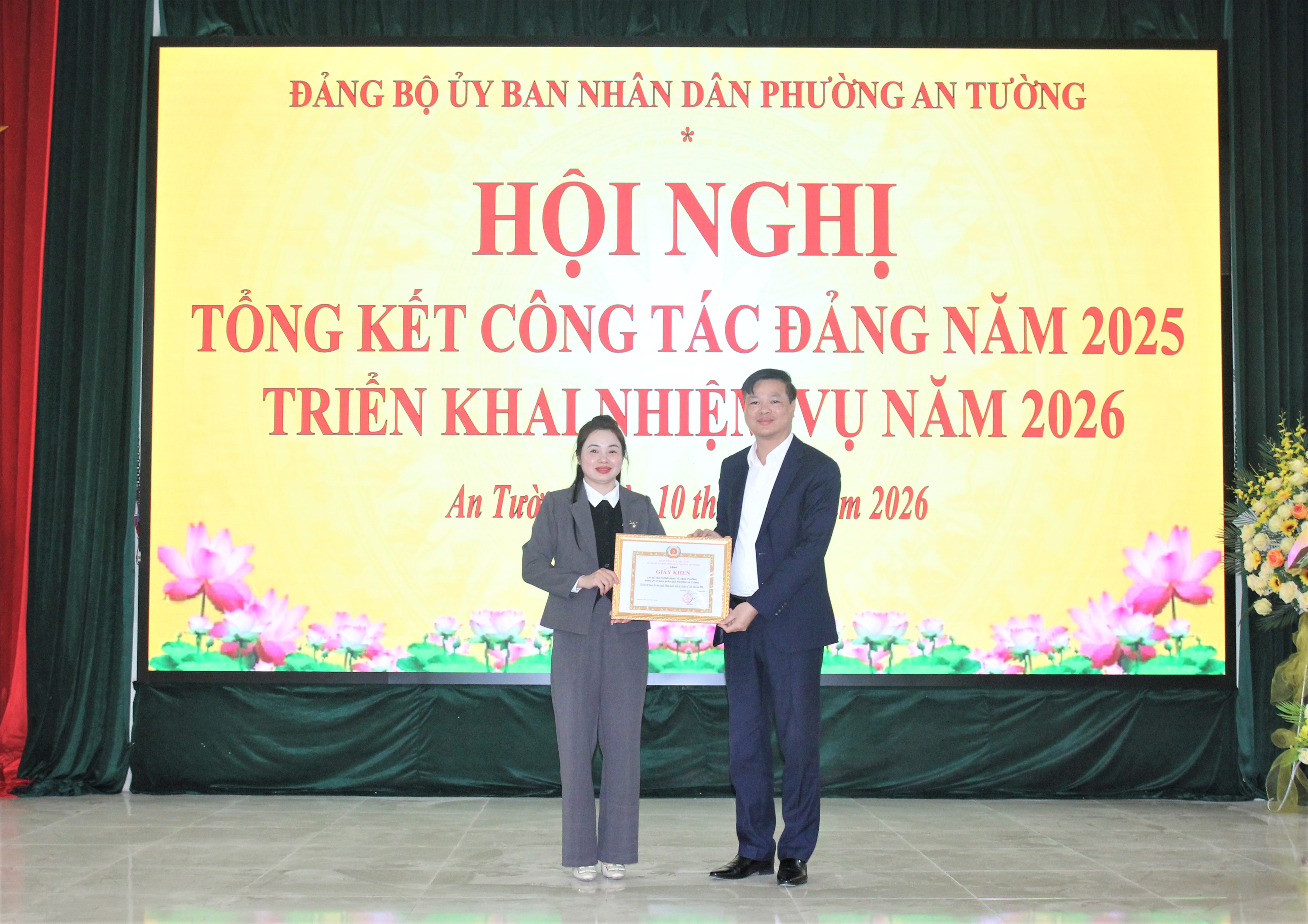 Đồng chí Đỗ Đình Đạt, Phó Bí thư Đảng ủy, Chủ tịch UBND phường, Bí thư Đảng ủy UBND phường trao giấy khen cho chi bộ Văn phòng HĐND và UBND phường, Đảng bộ UBND phường An Tường “Hoàn thành xuất sắc nhiệm vụ” tiêu biểu năm 2025.
