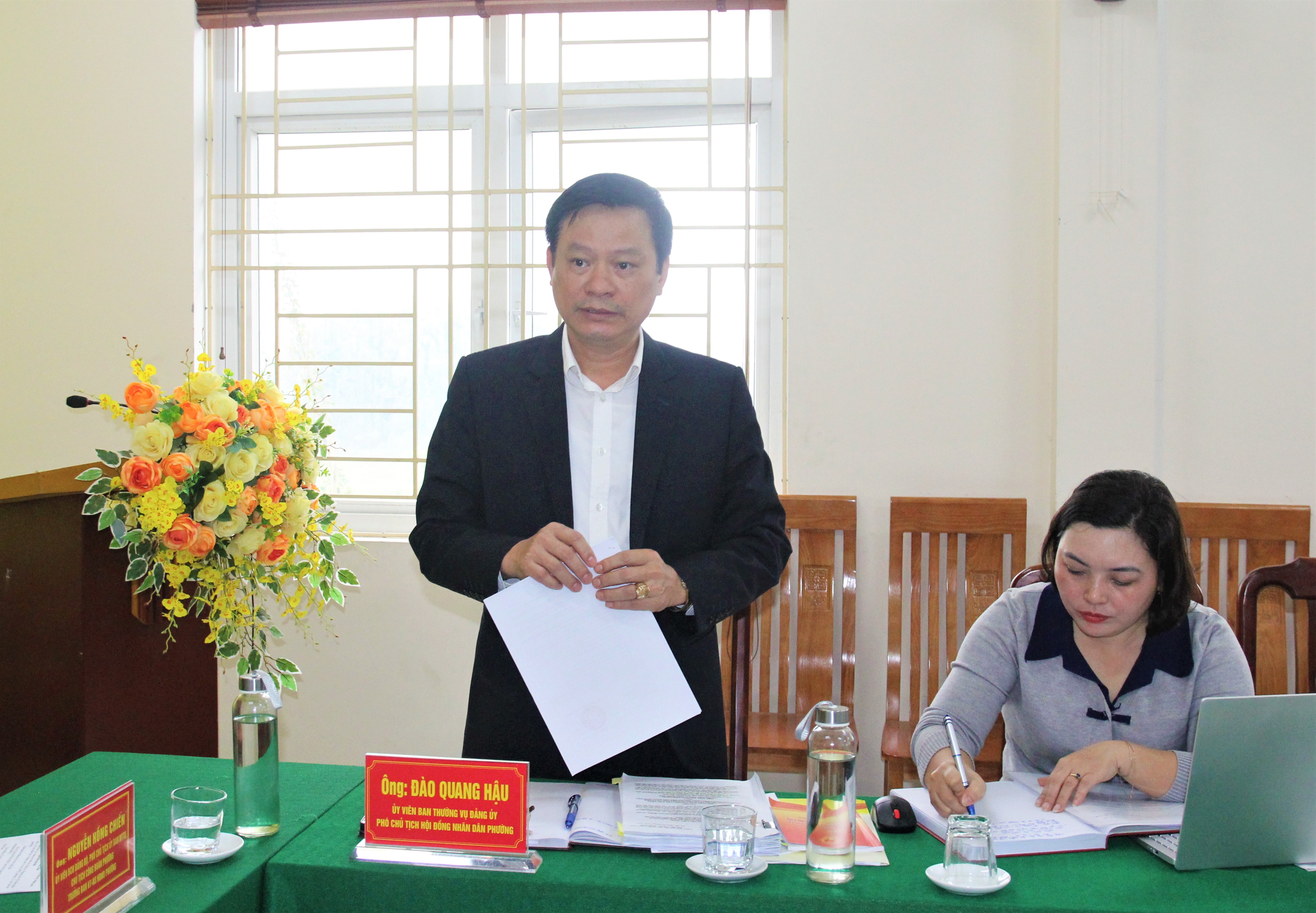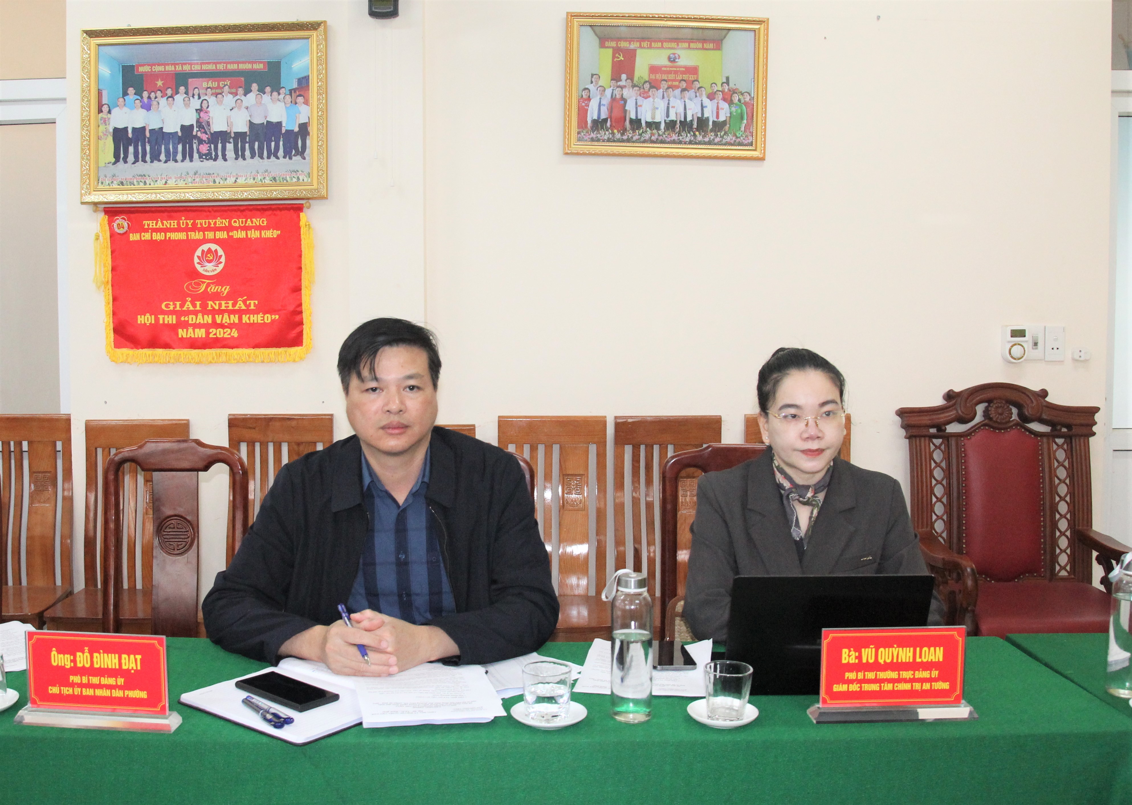 Các đồng chí Vũ Quỳnh Loan, Phó Bí thư Thường trực Đảng ủy, Giám đốc Trung tâm Chính trị An Tường; Đỗ Đình Đạt, Phó Bí thư Đảng ủy, Chủ tịch UBND phường, Chủ tịch Ủy ban bầu cử phường dự hội nghị