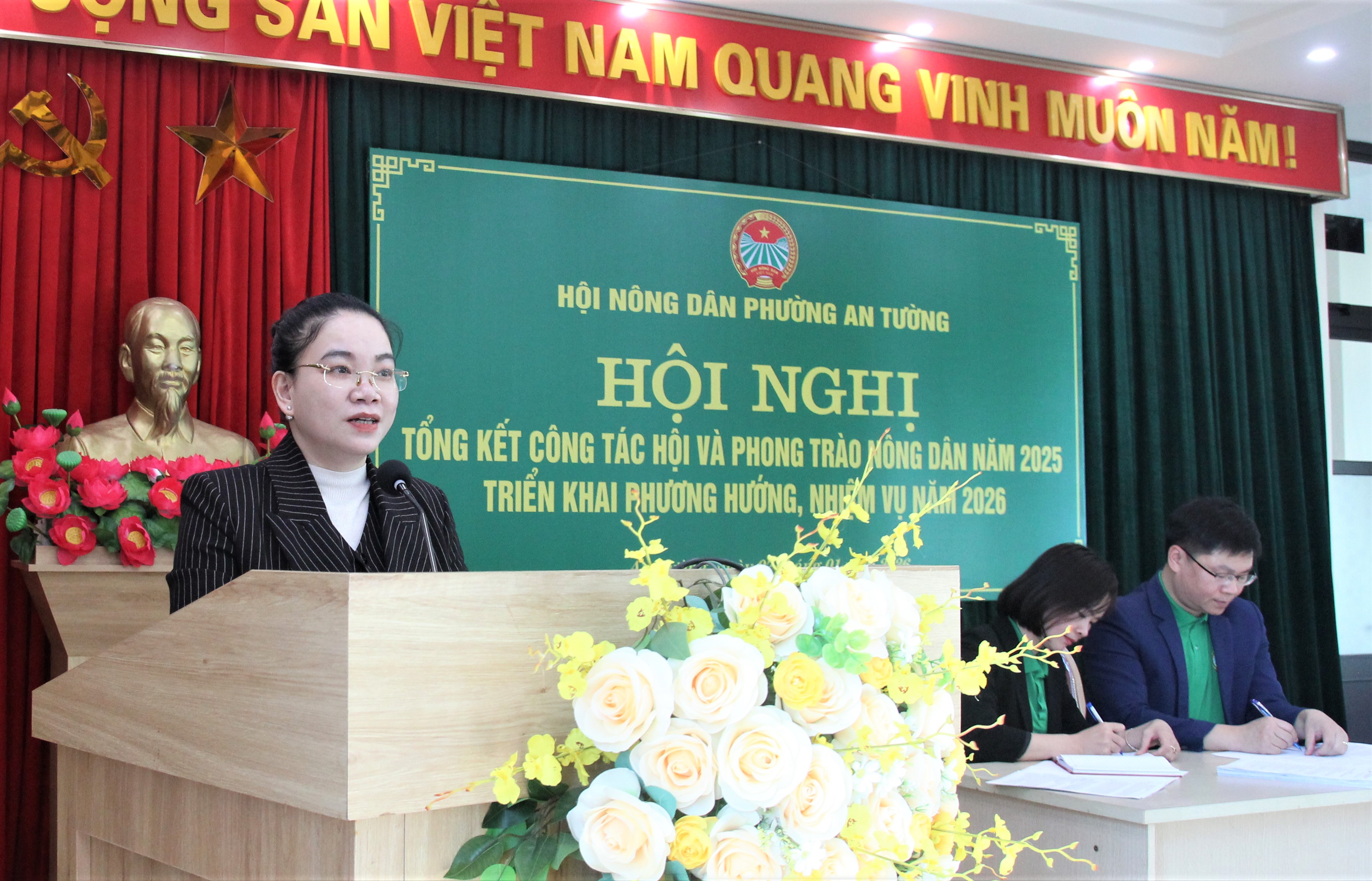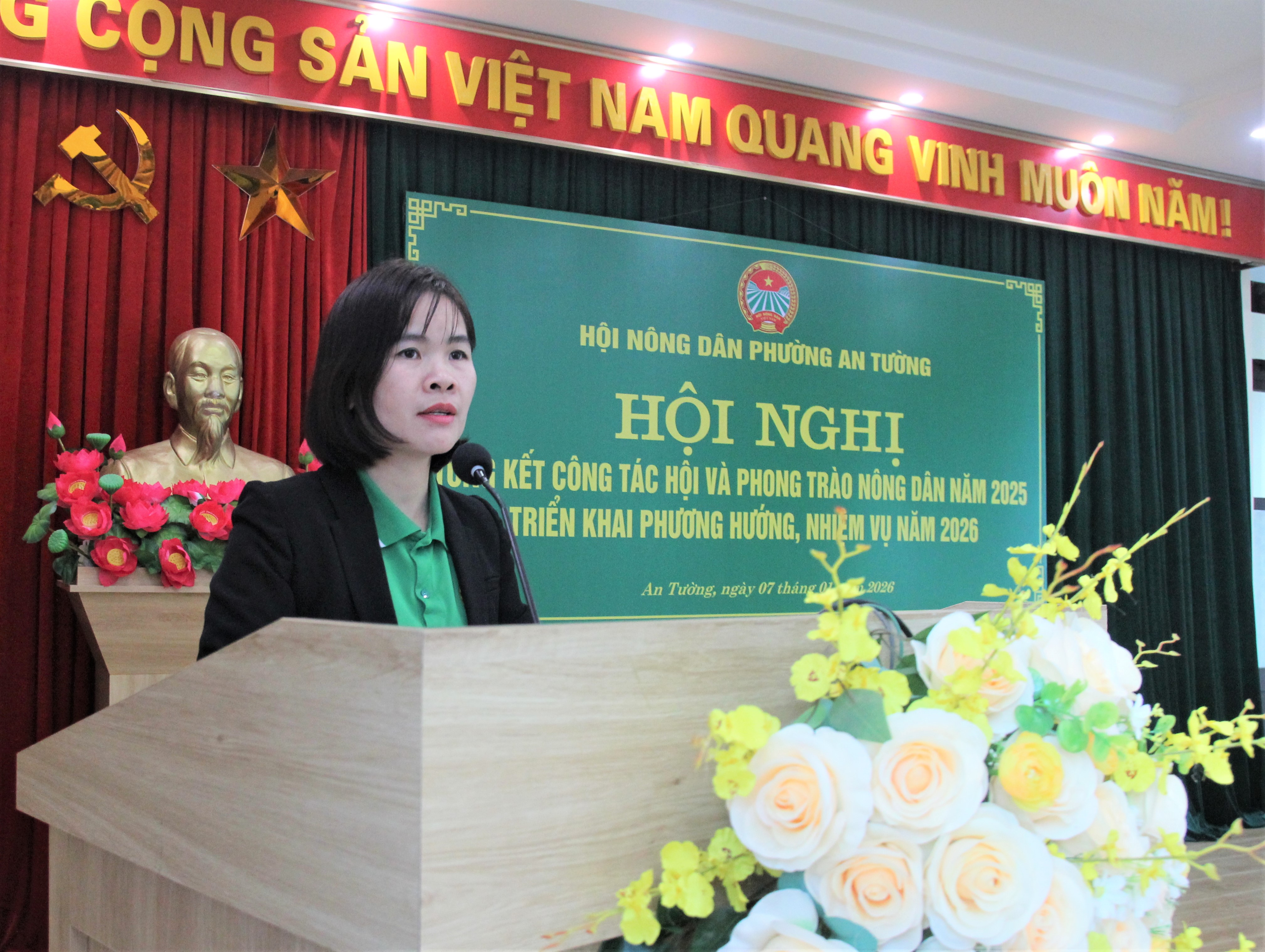 Phát biểu chỉ đạo tại hội nghị, đồng chí Vũ Quỳnh Loan, Phó Bí thư Thường trực Đảng ủy, Giám đốc Trung tâm Chính trị An Tường đã biểu dương, ghi nhận những nỗ lực và kết quả đạt được của Hội Nông dân phường trong năm 2025. Đồng chí đề nghị, thời gian tới Hội Nông dân phường tiếp tục củng cố, nâng cao chất lượng tổ chức Hội; đổi mới nội dung, phương thức hoạt động theo hướng thiết thực, hiệu quả, bám sát cơ sở. Tập trung đẩy mạnh phong trào nông dân thi đua sản xuất, kinh doanh giỏi gắn với phát triển kinh tế tập thể, ứng dụng khoa học kỹ thuật, chuyển đổi số và xây dựng các mô hình sản xuất hiệu quả. Đồng thời, phát huy vai trò của Hội trong tham gia xây dựng Đảng, chính quyền; tích cực giám sát, phản biện xã hội; chăm lo đời sống hội viên, thực hiện tốt công tác an sinh xã hội, góp phần giữ vững an ninh chính trị, trật tự an toàn xã hội, đóng góp tích cực vào sự phát triển kinh tế – xã hội của địa phương.