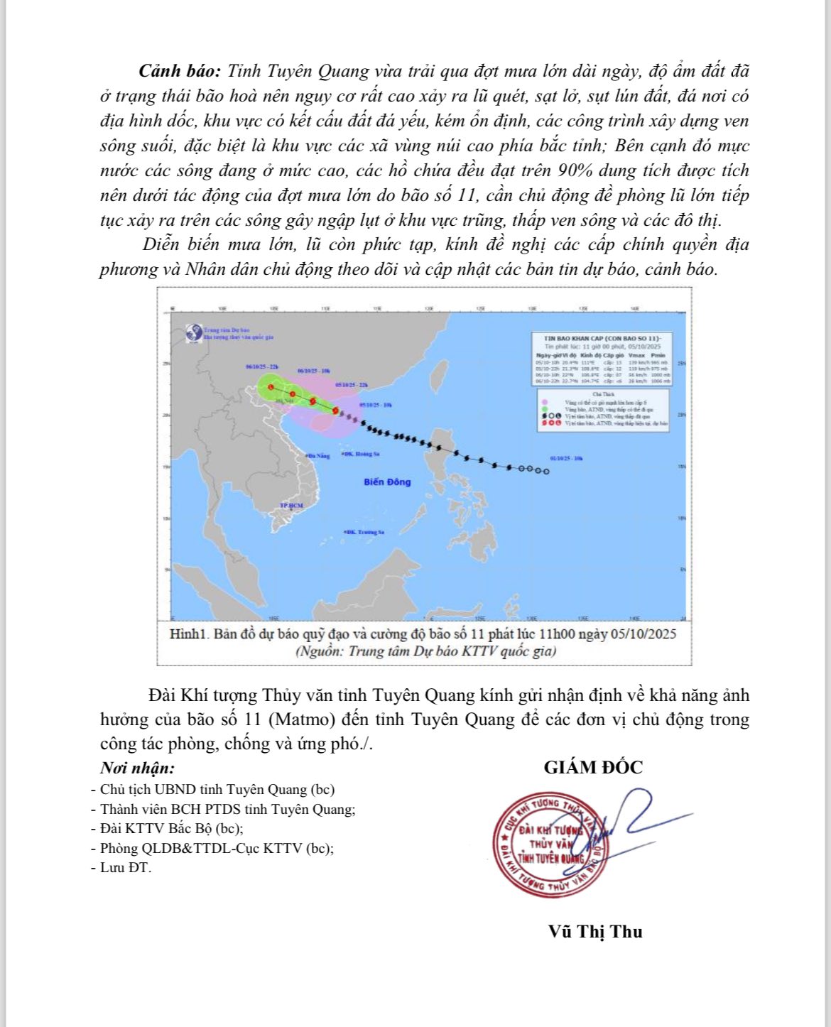 Theo Đài Khí tượng Thủy văn tỉnh Tuyên Quang, hồi 10 giờ ngày 05/10, vị trí tâm bão số 11 (Matmo) ở khoảng 20,4 độ Vĩ Bắc; 111,0 độ Kinh Đông, cách Móng Cái (Quảng Ninh) khoảng 350km về phía Đông Đông Nam, sức gió mạnh nhất vùng gần tâm bão cấp 12-13, giật cấp 16. Dự báo tối và đêm nay (05/10), bão ảnh hưởng đến vùng ven biển Quảng Ninh - Hải Phòng, sau đó di chuyển vào đất liền và tiếp tục ảnh hưởng đến các tỉnh Đông Bắc Bộ, trong đó có Tuyên Quang.