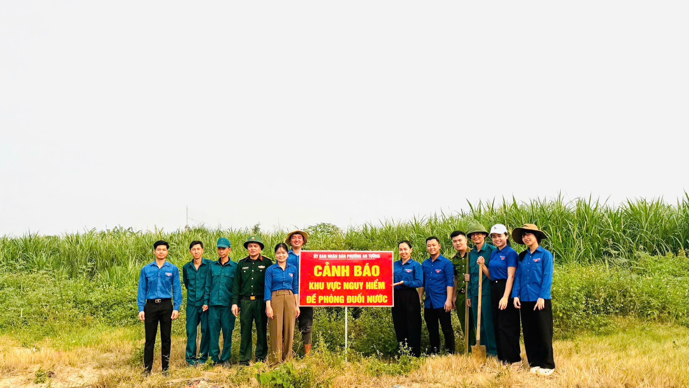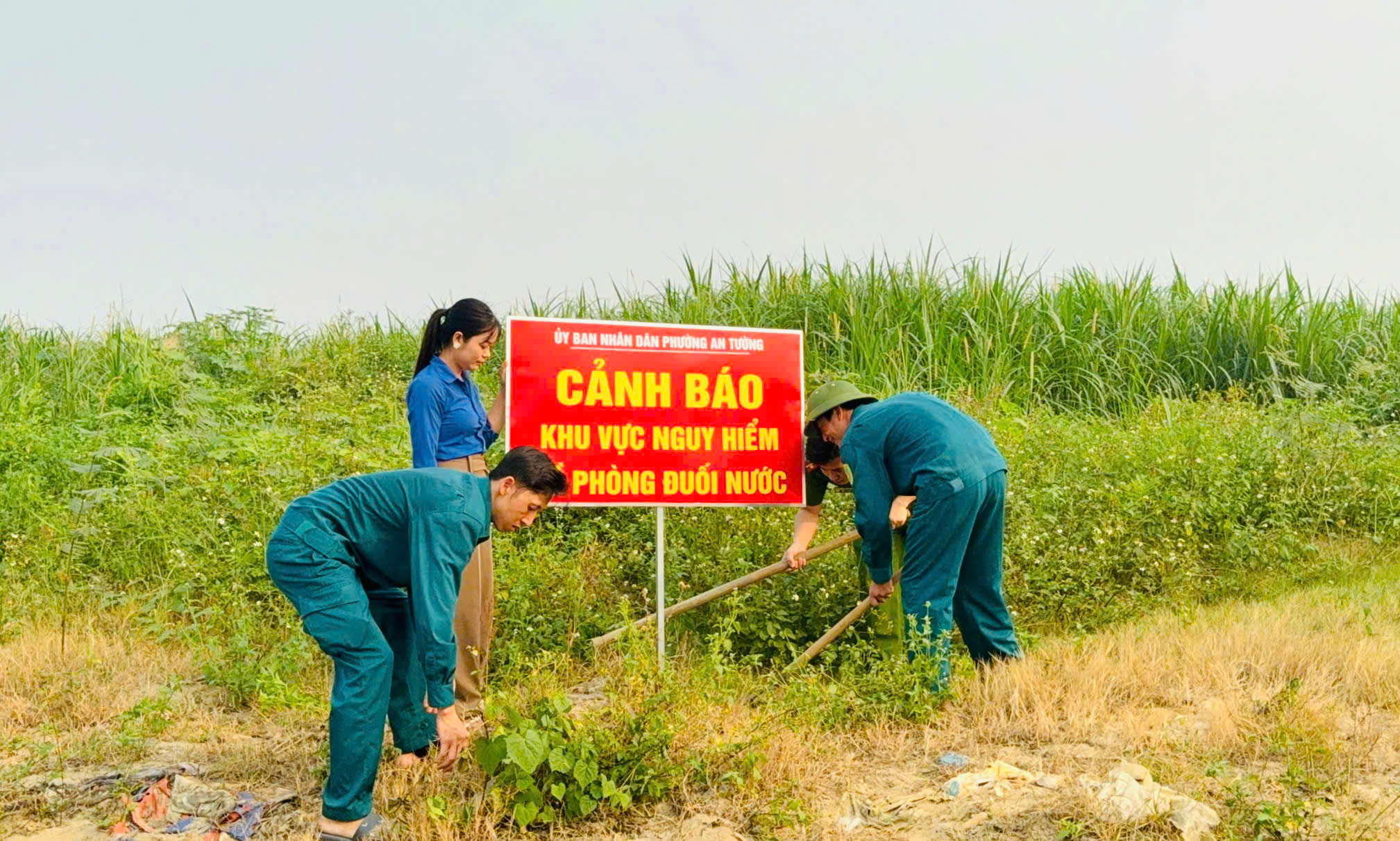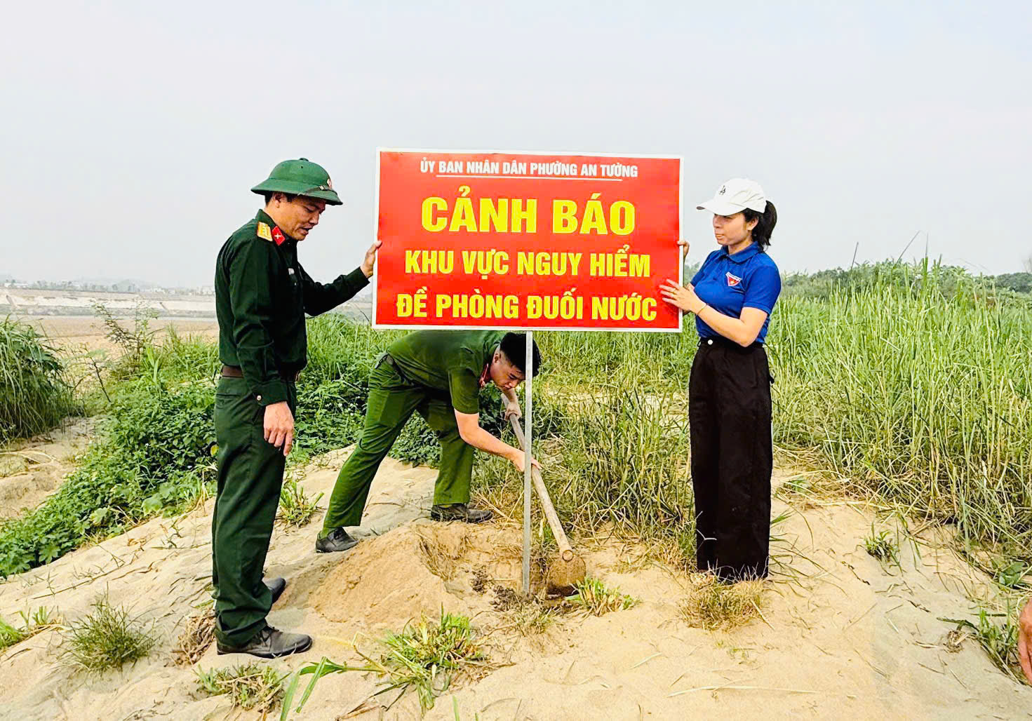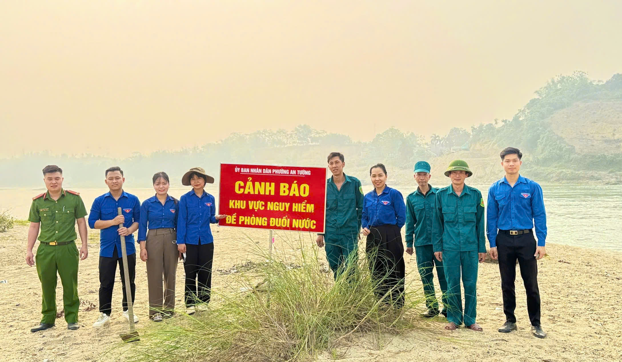 Đoàn viên thanh niên phường An Tường phối hợp với Ban Chỉ huy Quân sự phường cắm biển cảnh báo tại khu vực bãi soi dưới chân cầu Tình Húc.