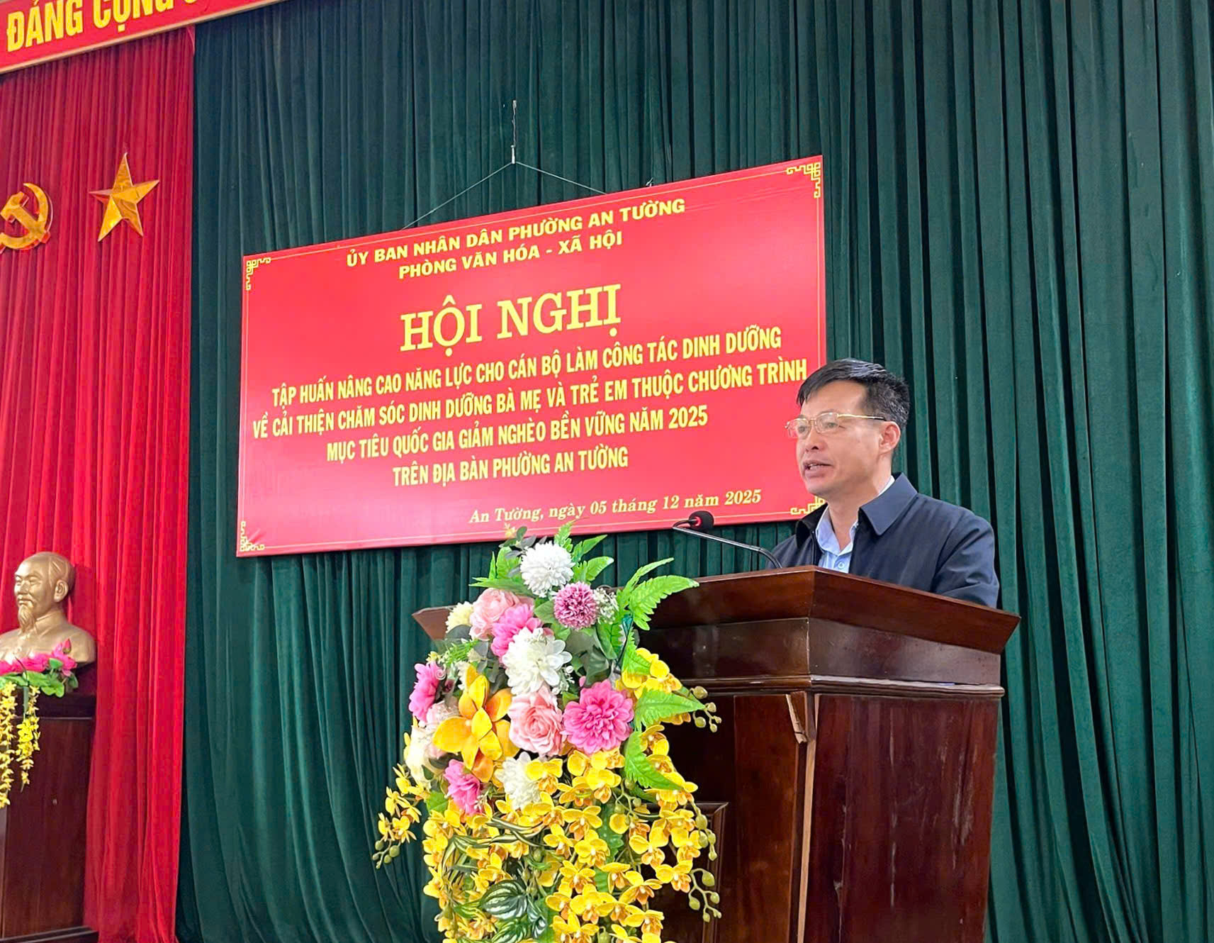 Phát biểu khai mạc hội nghị, đồng chí Phó Chủ tịch UBND phường Lưu Văn Khang nhấn mạnh, trong những năm qua, công tác chăm sóc sức khỏe nhân dân nói chung, đặc biệt là phụ nữ và trẻ em luôn được Đảng ủy, chính quyền phường An Tường quan tâm chỉ đạo thực hiện. Tuy nhiên, tình trạng suy dinh dưỡng, nhất là thể thấp còi ở trẻ em, vẫn còn là vấn đề đáng lo ngại. Hiện nay, trên địa bàn phường, tỷ lệ trẻ em suy dinh dưỡng thể cân nặng chiếm khoảng 7,16%, thể thấp còi 16,34%. Một số nơi tỷ lệ trẻ bị suy dinh dưỡng vẫn còn cao; chế độ ăn uống và thực hành dinh dưỡng tại hộ gia đình chưa hợp lý, công tác truyền thông, hướng dẫn chăm sóc sức khỏe chưa thường xuyên, đồng bộ. Đồng chí đề nghị các đại biểu tập trung tham gia nghiêm túc, tích cực thảo luận và chia sẻ kinh nghiệm thực tế ở cơ sở; Nắm chắc các quy định, hướng dẫn chuyên môn của Bộ Y tế (theo Quyết định số 3452/QĐ-BYT ngày 06/9/2023) để áp dụng đúng trong công tác chăm sóc sức khỏe, cải thiện dinh dưỡng tại tổ dân phố. Sau tập huấn, chủ động tuyên truyền, hướng dẫn lại cho người dân nhằm thay đổi hành vi, thói quen dinh dưỡng, góp phần thực hiện hiệu quả mục tiêu giảm tỷ lệ suy dinh dưỡng trẻ em và nâng cao chất lượng dân số trên địa bàn phường.