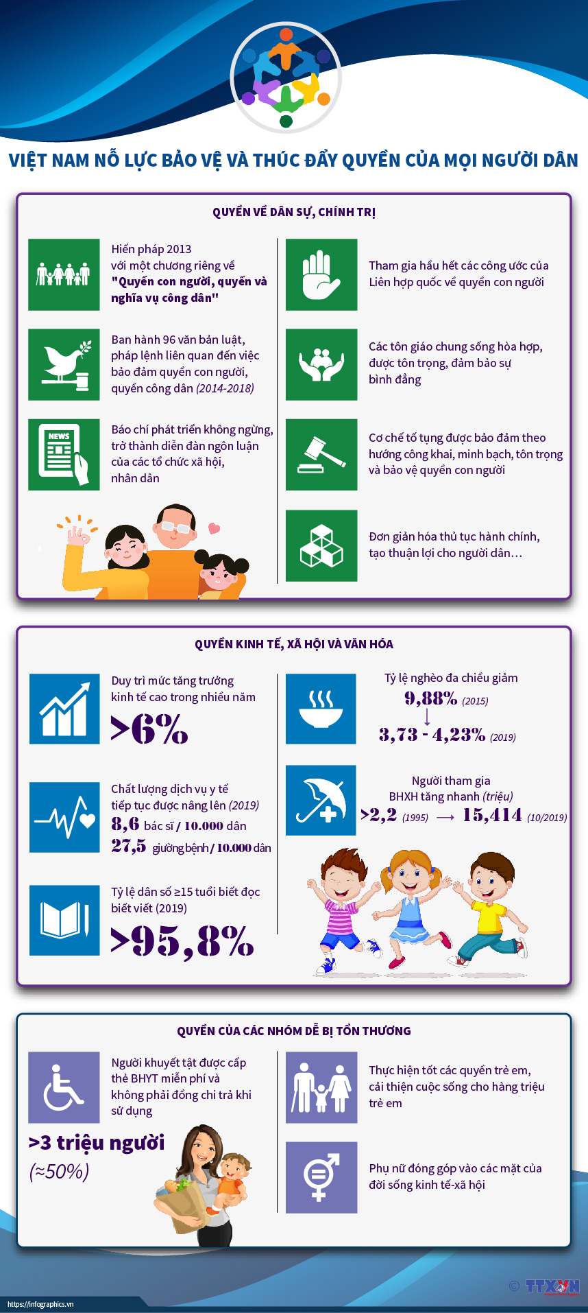Trong mọi giai đoạn lịch sử, Việt Nam luôn nhất quán mục tiêu, chính sách tất cả vì con người, vì một nước Việt Nam dân giàu, nước mạnh, dân chủ, công bằng, văn minh. Đảng và Nhà nước Việt Nam đã không ngừng nỗ lực để người dân được thụ hưởng đầy đủ các quyền và tự do cơ bản của con người, đồng thời coi trọng thúc đẩy hợp tác quốc tế trong lĩnh vực nhân quyền trên cơ sở bình đẳng, tôn trọng và hiểu biết giữa các quốc gia.